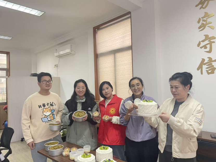 活動現(xiàn)場,文化禮堂的長桌上擺滿了學(xué)員們的成果:有前幾期課程教授的“桃花香”大米布丁,圓潤的模具里盛著乳白的布丁,表面點(diǎn)綴著新鮮草莓,米香與奶香撲鼻;還有以大立有機(jī)茶為原料的綠茶戚風(fēng)蛋糕,淺綠的蛋糕坯層次分明,頂部的青提顆顆飽滿,茶香在空氣中輕輕縈繞;更有學(xué)員熟練復(fù)刻了蛋黃酥,金黃的酥皮層層起酥,掰開后咸蛋黃的油潤與紅豆餡的清甜相得益彰。
