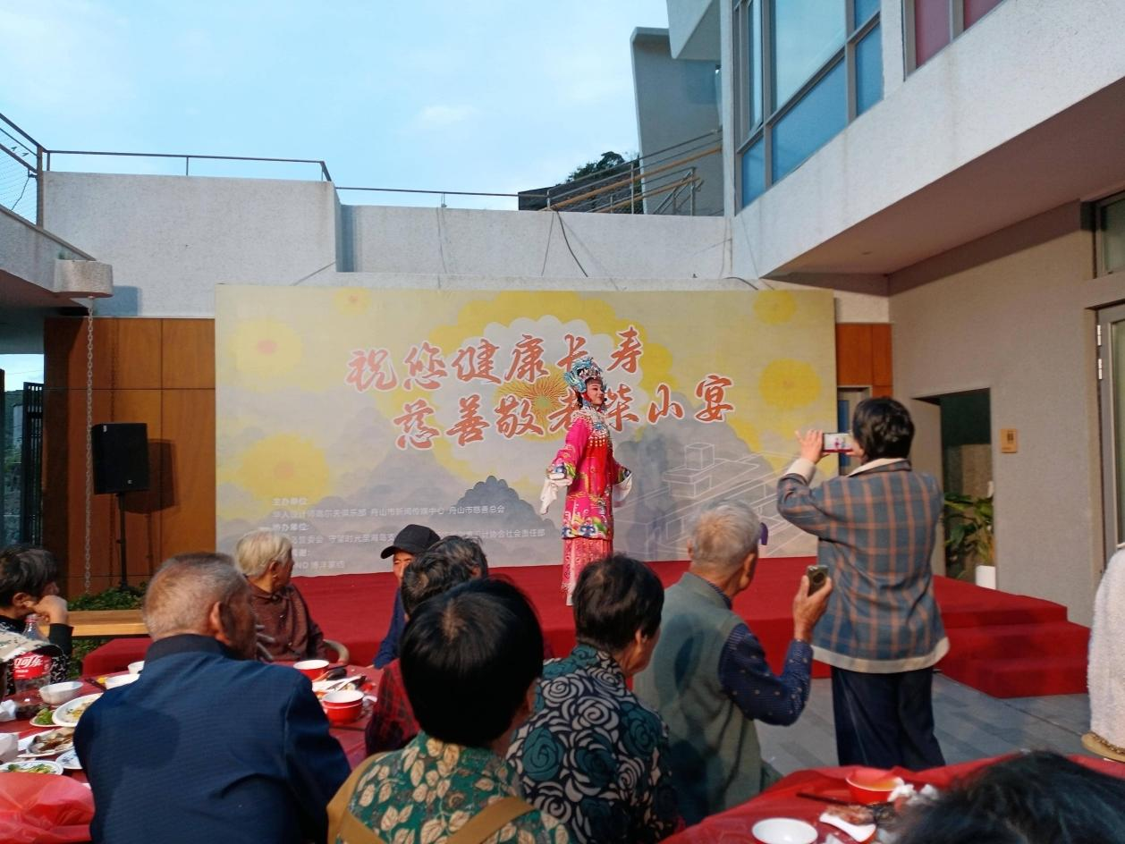 活動現(xiàn)場,志愿者與黨員干部為村里老人們準備了一桌桌家常菜。老人們圍坐舉杯、閑話家常,歡聲笑語不斷,滿是溫馨氛圍。隨后,越劇演員身著精致戲服登場,演唱經(jīng)典選段,婉轉(zhuǎn)唱腔與細膩身段贏得臺下陣陣喝彩,不少老人跟著節(jié)奏輕輕哼唱。